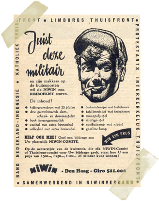 Op het s.s.Zuiderkruis hadden wij nog de Dienst Welfare maar sinds onze ontscheping hebben wij de NIWIN. "Nationale Inspanning Welzijnsverzorging INdië". Dank zij de NIWIN beschikken wij over schaakspelen, boeken en sportbenodigdheden. Deze onvolprezen organisatie verzorgt ook het optreden van Hollandse artiesten. The Millers met Pia Beck, de Kilima Hawaïans en velen andere gezelschappen maken een tournee langs de steden. Sommige dapperen treden zelfs op voor de jongens op de buitenposten.