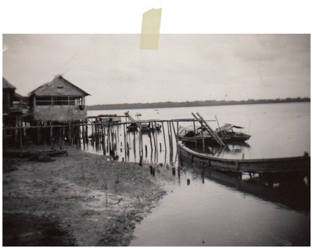 Maar plotseling, wie zien wij daar? Onze prauw van gisteren! Geen gebalde vuistjes deze keer? Dat komt door het type schip waar men mee vaart, denk ik. Na zeven uur varen doemde de armzalige kampong Soeng Sang weer op. Bamboehutjes op palen en met een dakbedekking van palmbladen en de enige dorpsstraat bestond uit een eindeloos lange steiger. Het loopvlak van deze steiger bestond uit gekloofde palmstammetjes die met de bolle kant naar boven lagen, met rotan waren ze aan de onderbalken vastgebonden. Alleen de tangsi (kazerne), die was van echt hout gemaakt. De grootste loods was voor het voetvolk bestemd. Rechts daarvan stond het 'witte huis'. Onze pelotonscommandant vaandrig van Daalen vond daarin zijn onderkomen. Aan de voorkant van de tangsi was een lange steiger gebouwd, lang genoeg om bij laagwater onze patrouilleboten te kunnen opvangen. Rechts van de steiger lag het wrak van een Japanse landingsboot. Het geraamte lag in de modder juist op de vloedlijn. Vanuit de verte leek het op het geraamte van een reuze walvis. Een macaber schouwspel.